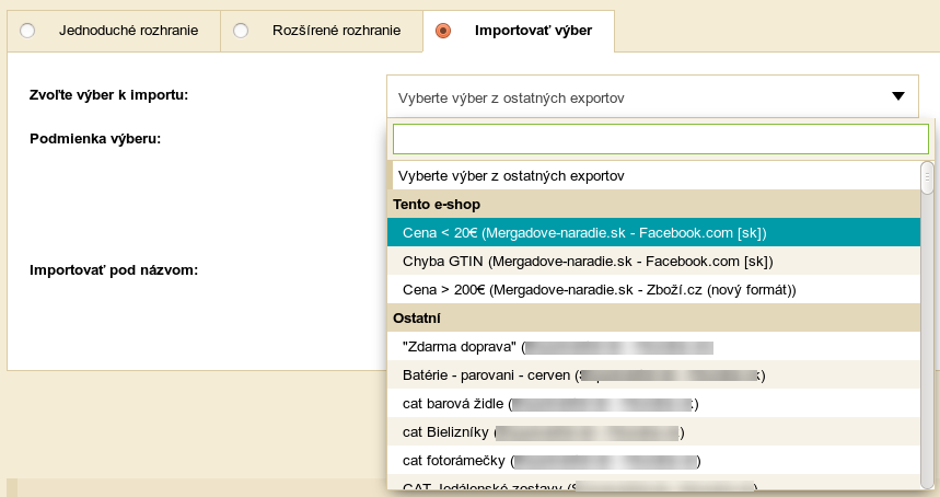 Další novinka vychází z vašeho feedbacku na Mergado fóru. Ve okamžiku, kdy chcete naimportovat nějaký výběr, se doposud zobrazovali všechny výběry ze všech exportů, ke kterým máte oprávnění, a to abecedně. Uzmali jsme, že to není nejlepší způsob řazení výběrů a momentálně se zobrazují jako první výběry z daného e‑shopu, na kterém právě pracujete, a následně výběry z ostatních exportů.