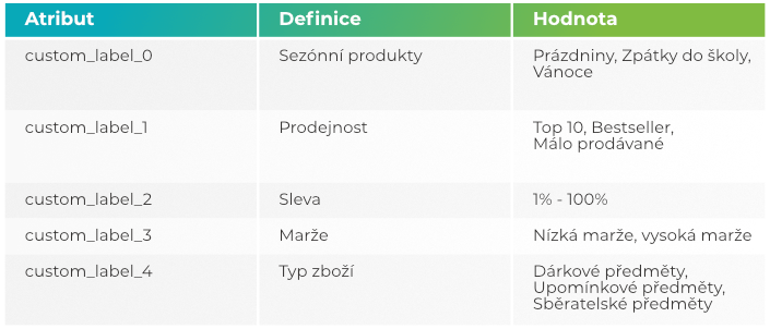 Google umožňuje u každého z produktů vytvořit až 5 vlastních štítků. Jak to funguje? V Google feedu přidejte k produktu unikátní informaci, kterou ale zákazník nikde neuvidí. Roztřídíte tím váš sortiment podle specifických atributů, například podle PNO, sezónnosti zboží, marže nebo nejprodávanějších produktů. Kampaně následně nastavíte s ohledem na přidané štítky. A to nejen v rámci Google Shopping, ale také pro Google Ads.
