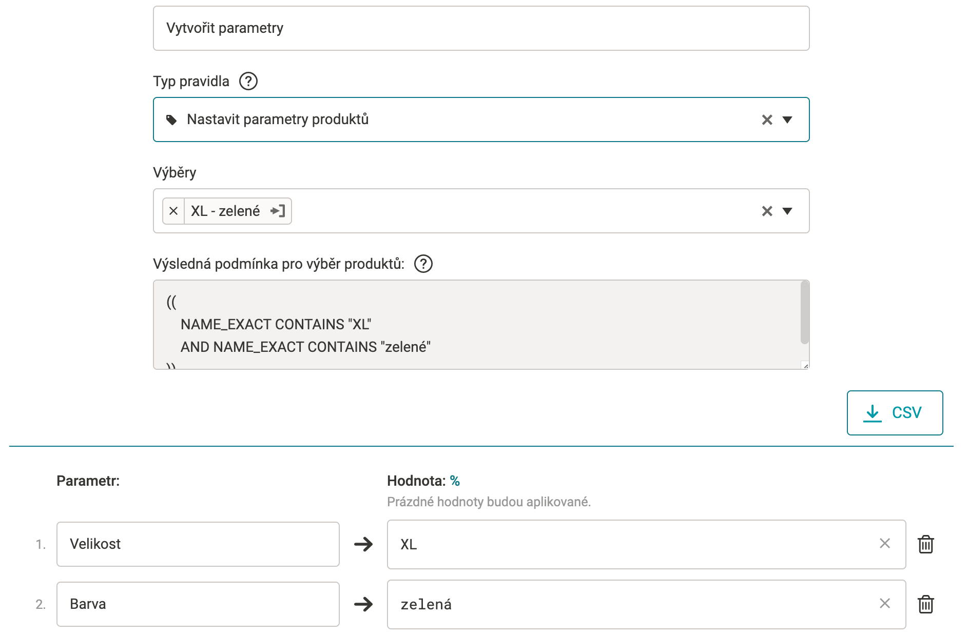 Protože pravidlo Nastavit parametry produktů nemá pokročilé možnosti nastavení, může se někdy hodit tímto pravidlem provést jen inicializaci, tj. vytvoření jen názvů parametrů a následně konkrétní hodnoty k parametrům už budeme přidávat jinými typy pravidel.