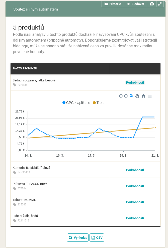 - Ovlivňování CPC – jestliže k úpravě ceny za proklik dochází i mimo Bidding Fox (např. v administraci srovnávače), appka vypíše dotyčné produkty, jejichž nastavení mimo BF je třeba najít a smazat, aby automatický bidding fungoval správně